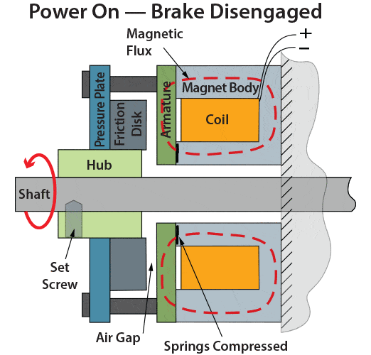 Low-cost power-off brake that is electromagnetically released. The relatively thin profile of these brakes compared to normal spring applied brakes make them a perfect candidate for a variety of applications while providing a good torque to size ratio.